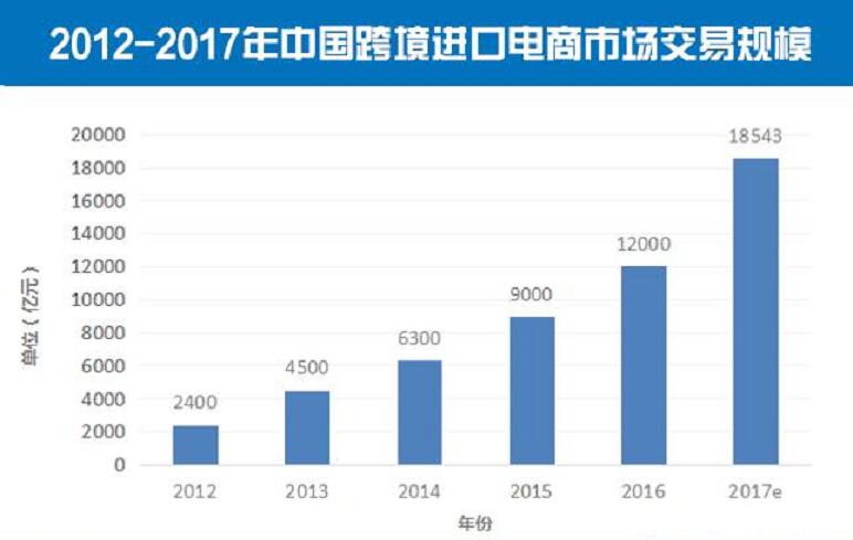 报告显示,2016年,中国跨境进口电商交易规模为12000亿元,这意味着中国跨境进口电商交易规模首度跨入“万亿时代”。对比2015年的9000亿元,同比增长33.3%,预计2017年将达18543亿元。
