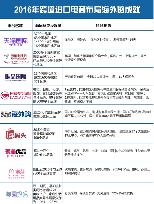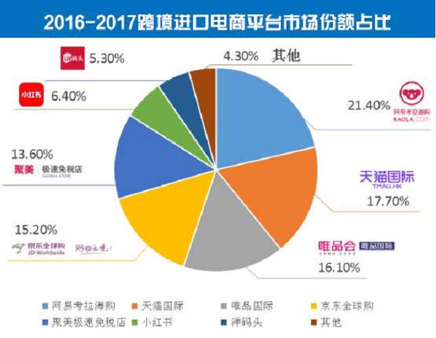 2016年,在主流的跨境进口电商平台中,按整体交易额计算,网易考拉海购排名第一,占21.4%份额;天猫国际购名列第二,占据17.7%份额;唯品国际位于第三,占16.1%份额;排名第四的是京东全球购,市场占比15.2%;排名第五的是聚美极速免税店,占13.6%的份额;排名第六、第七的平台是小红书和洋码头,分别占6.4%以及5.3%;其他的跨境进口电商平台,包括宝贝格子、蜜芽、宝宝树等平台占总市场份额的4.3%。