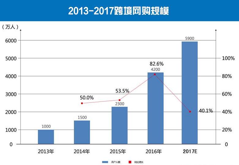 报告显示,2016年我国跨境网购用户达0.42亿人,同比增长82.6%。预计2017年跨境网购人数将达到0.59亿人。