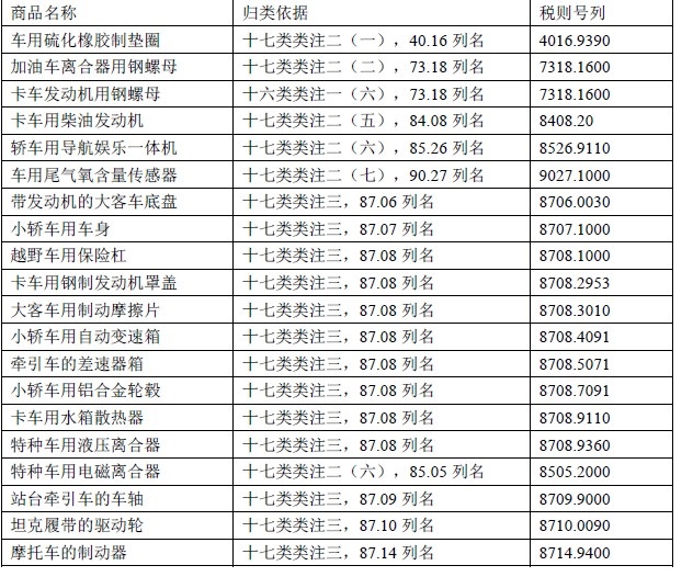 (一)首先,对汽车零件进行归类时,要确认其是否符合十七类类注二排它条款所的规定,例如: