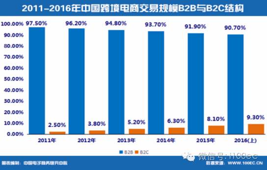 据中国电子商务研究中心(100EC.CN)监测数据显示,2016年上半年,中国跨境电商的交易模式跨境电商B2B交易占比达到90.7%,跨境电商B2B交易占据绝对优势,跨境电商B2C交易占比9.3%。