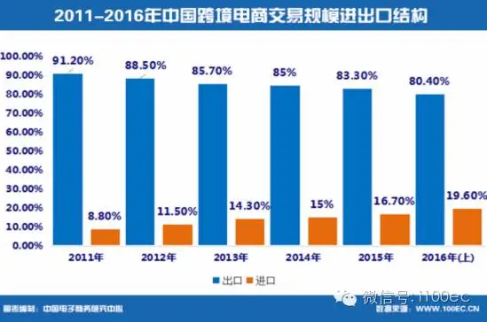 据中国电子商务研究中心(100EC.CN)监测数据显示,2016年上半年,中国跨境电商的进出口结构出口占比达到80.4%,进口比例19.6%。